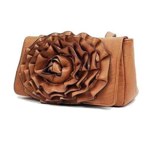 Sleek blooming flower adds instant elegance. Show off your girly side with this clutch's soft, feminine hues. Long adjustable shoulder strap adds versatility and style. Made from textured faux leather. Back zipper compartment and magnetic snap flap over a zip top closure. Fully lined compartment. Interior zipper pocket, PDA cell phone slip pocket. BEFORE PURCHASING, PLEASE COMPARE THE SIZE OF THIS HANDBAG TO ONE OF YOUR OWN FAVORITE BAGS.